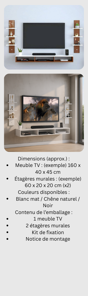 Donnez du style à votre espace de vie avec ce meuble TV moderne accompagné de ses étagères murales assorties. Parfait pour organiser et sublimer votre coin salon, cet ensemble offre à la fois un support robuste pour votre téléviseur et des étagères décoratives pour vos livres, plantes ou objets design.