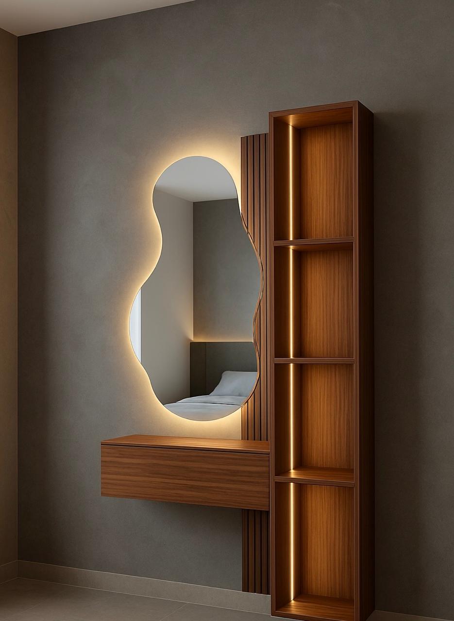 Un miroir mural asymétrique rétroéclairé, à la forme organique originale, apportant une ambiance chaleureuse et contemporaine.